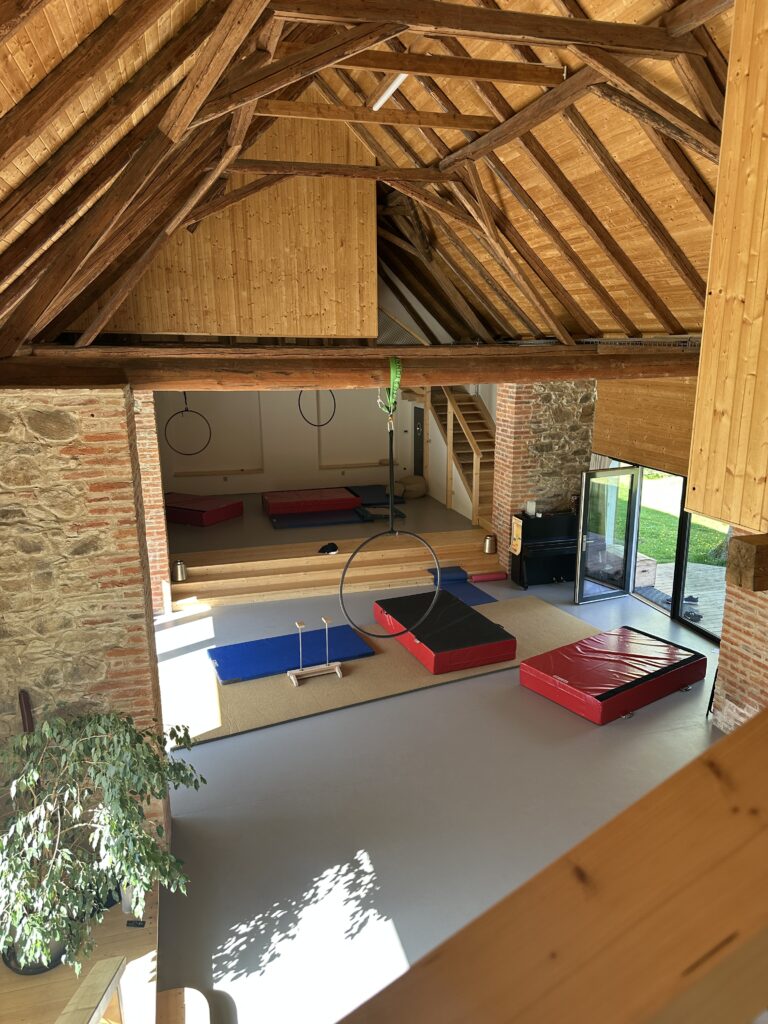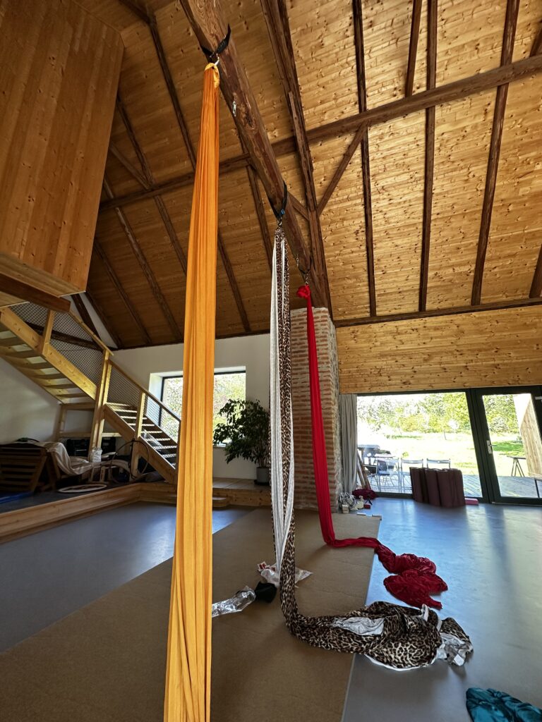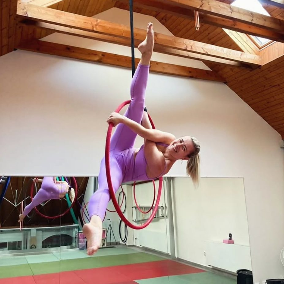 - Volný trénink: K dispozici vybavení jako žíněnky, airtrack i aerial hoop i silks